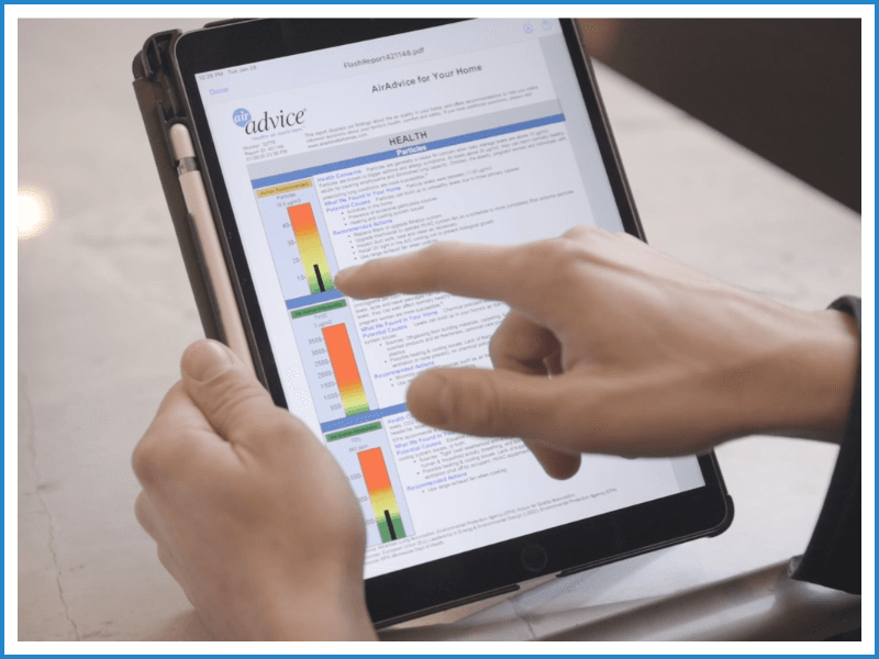 The monitor is unobtrusive, measuring 8" H x 4.5" W x 3.5" D. Its operation is virtually silent. After the air sampling is complete, we will provide you with a full-color IAQ report that enables you to "see" your home's daily air quality. Together we can then determine what may be affecting your home's indoor air and when those changes occur. The report also suggests ways to solve your air quality problems.